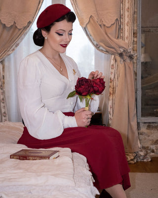 Le chemisier Jay est un original « Couturière de Bloomsbury ». Si vous aimez le design et les détails vintage, ces vêtements vous offrent une qualité absolument authentique et un style des années 1940. Souvent des reproductions exactes d'articles vintage de première classe, elles sont fabriquées à votre taille, parfaites et neuves. L'authentique tissu rayonne crêpe de Chine se drape magnifiquement et ressemble beaucoup à de la soie. Cependant, il est facile d'entretien et peut être lavé à la main ou même en machine sur cycle délicat.