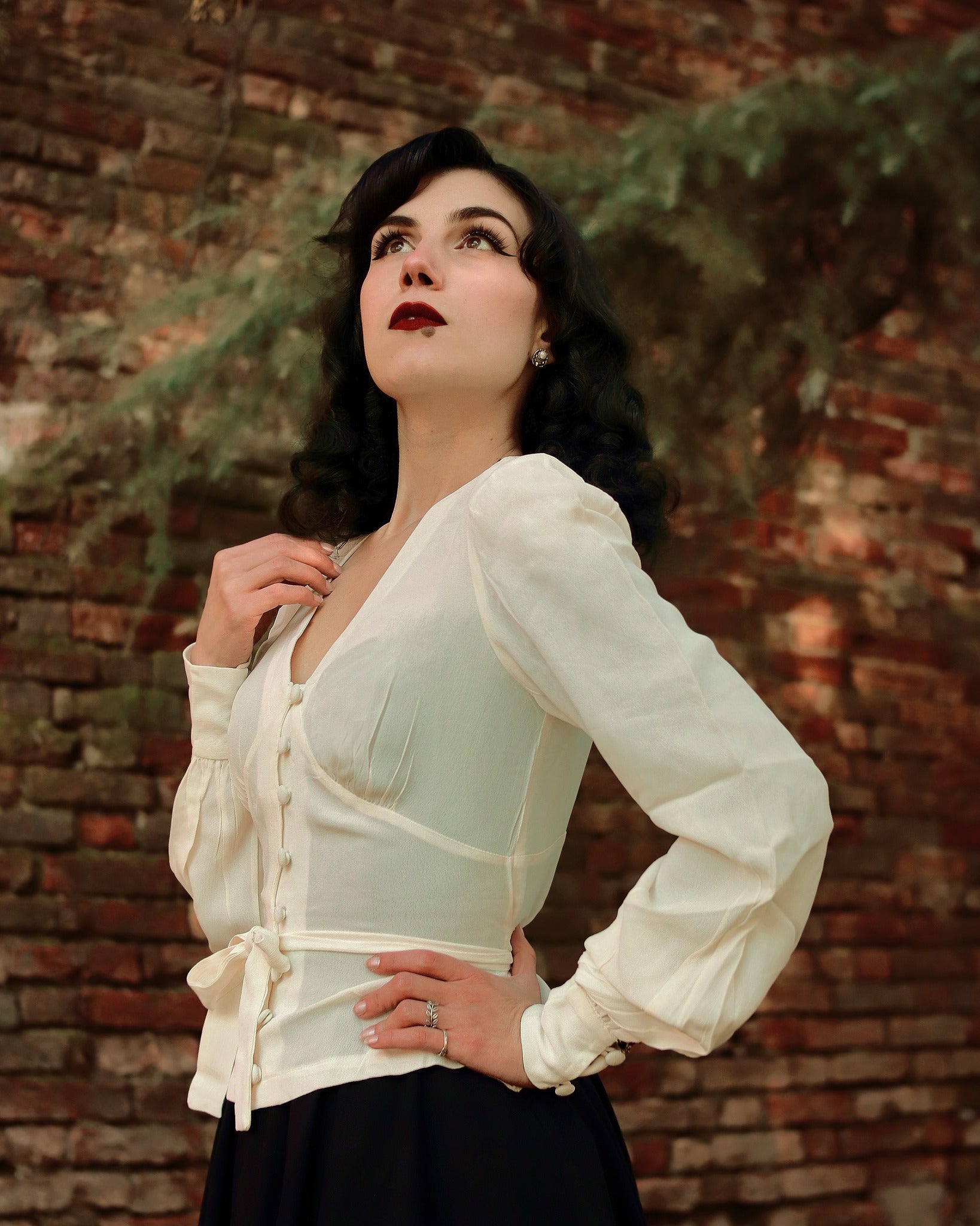 La blouse parfaite des stars de cinéma des années 40. Les détails vintage exquis sont conçus pour flatter et faire ressortir la femme fatale qui sommeille en vous. Les fronces cintrées sous la poitrine donnent une ligne féminine aux filles les plus minces, mais réduisent également le volume et soulignent la taille pour celles qui ont une silhouette de pin-up. De nombreux petits boutons de fermeture en boucle descendent du point le plus profond de l'encolure en V soulignant la taille, mais le secret particulier de la blouse Jay réside dans la ceinture à nœud que l'on noue dans le dos pour que la blouse s'adapte parfaitement à votre corps. Les manches amples généreuses se terminent également par une fine manchette à deux boutons. Ni le tissu ni le savoir-faire de la couturière n'ont été rationnés ici !