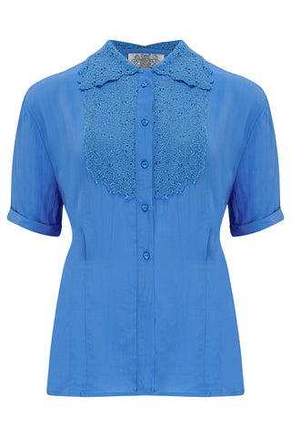 Un autre fabuleux favori des années 40, ce magnifique chemisier a un col en dentelle magnifiquement coupé à la main et un empiècement sur le devant. Avec de petits plis inversés très astucieux aux emmanchures devant ; fini avec de jolis petits boutons en forme de cœur, tellement féminins. Fabriqué en tissu crêpe de Chine naturel emblématique, ce vêtement ne contient aucune fibre synthétique.