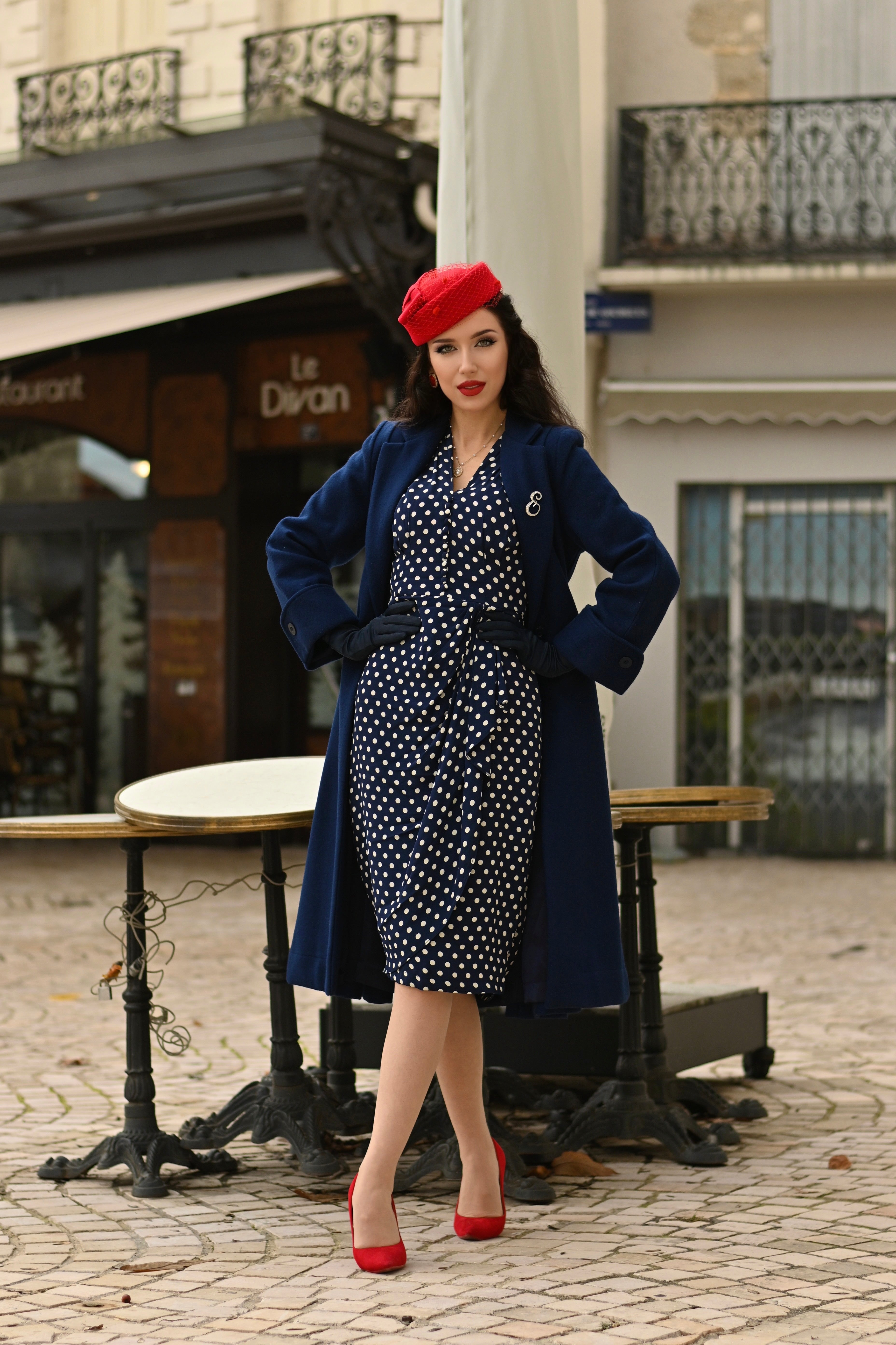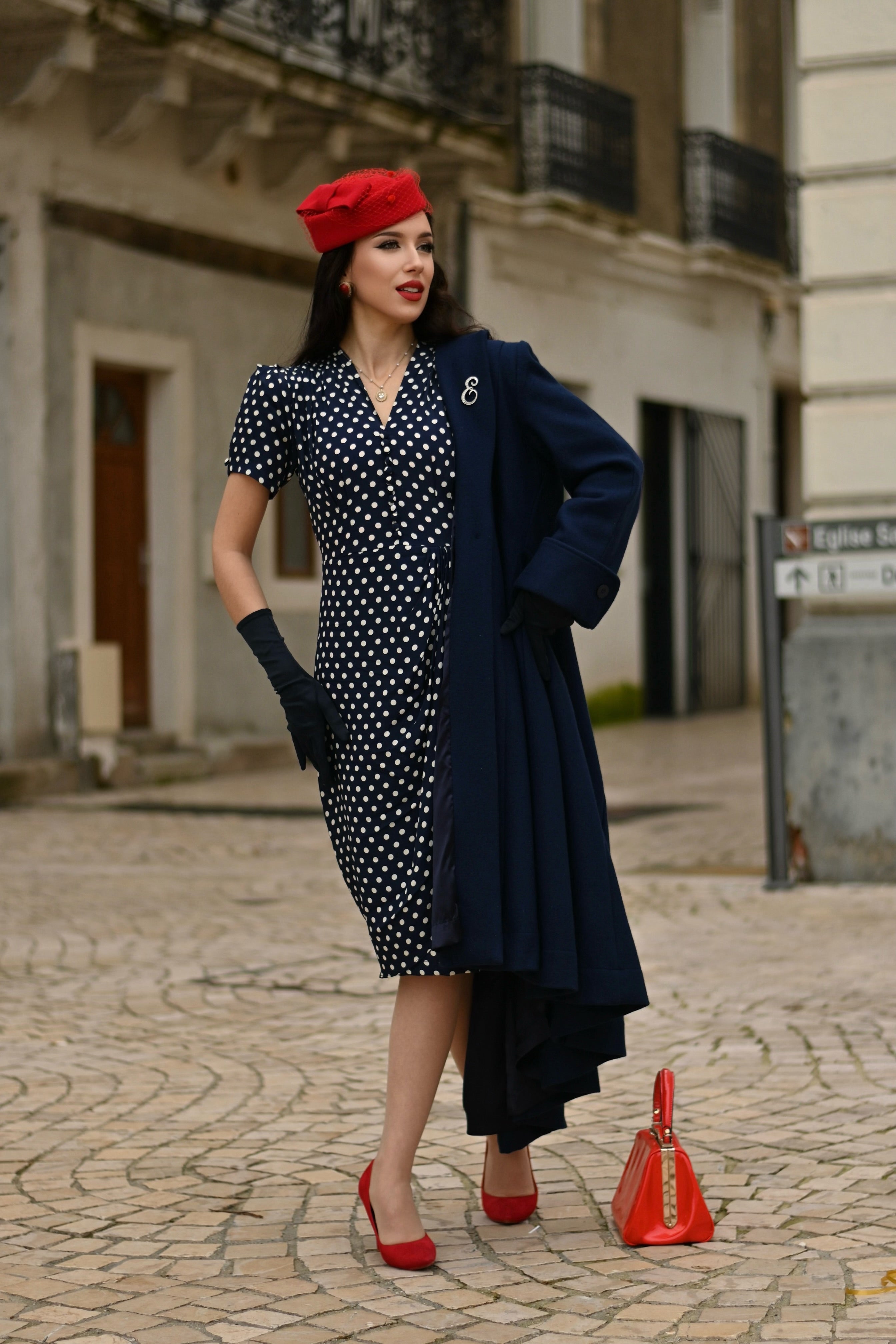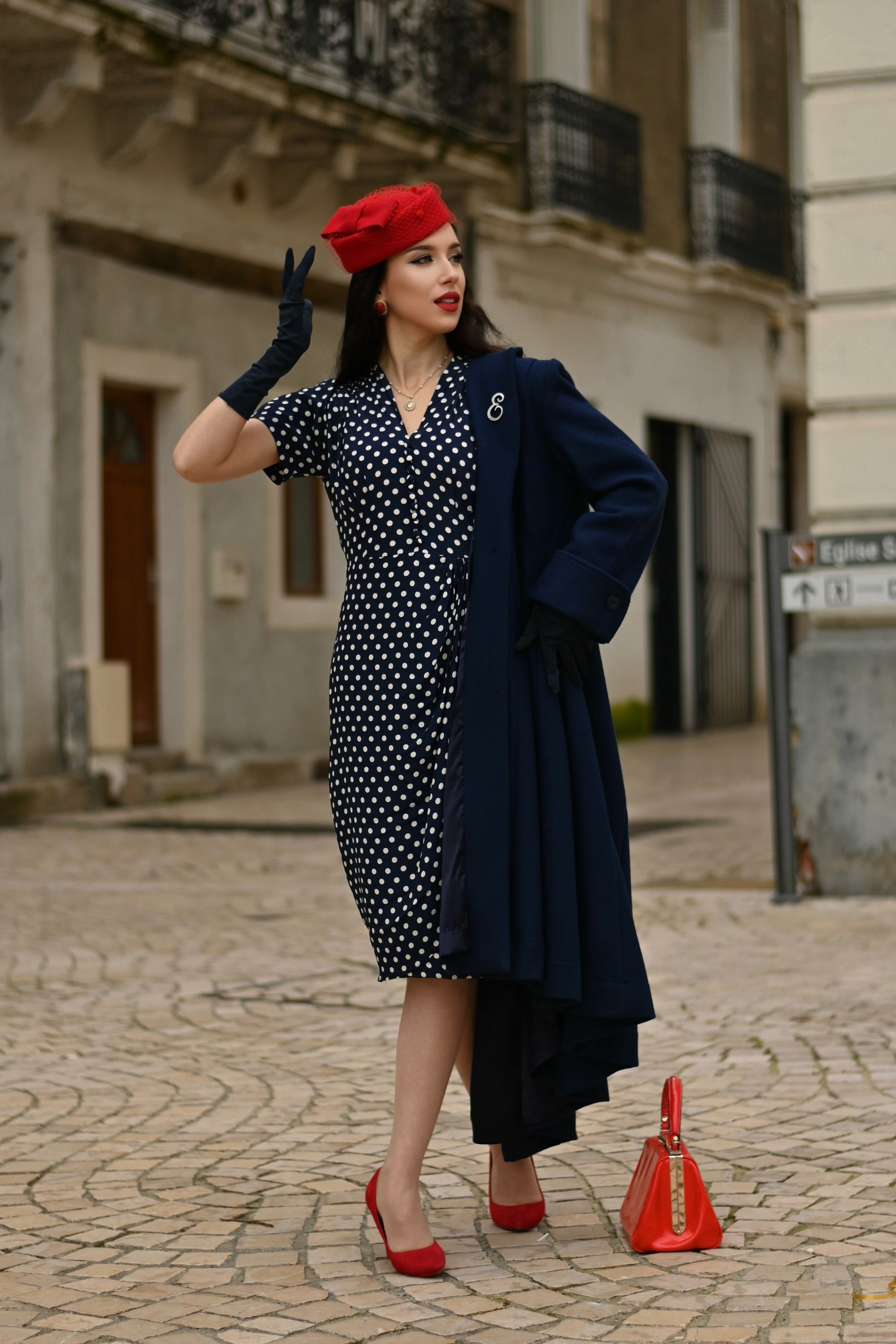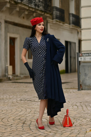 Robe « Mabel » en bleu marine à pois, un style vintage classique inspiré des années 1940