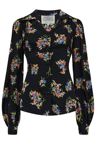 Poppy Long Sleeve Blouse in Black Floral Dancer, Authentic & Classic 1940s Vintage Style