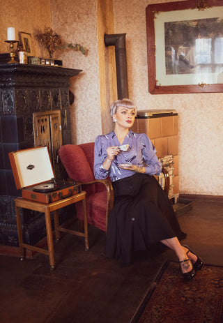Une belle jupe Full Circle des années 1950 avec un devant entièrement boutonné et des poches intérieures soignées. Les boutons ont de jolis bords texturés, tout comme les originaux, il a des tonnes de tissu qui pend luxueusement et se balance magnifiquement en un cercle complet lorsque vous tournez et tourbillonnez. Le tissu Polly Crepe s'accroche magnifiquement, est super doux au toucher et facile d'entretien.