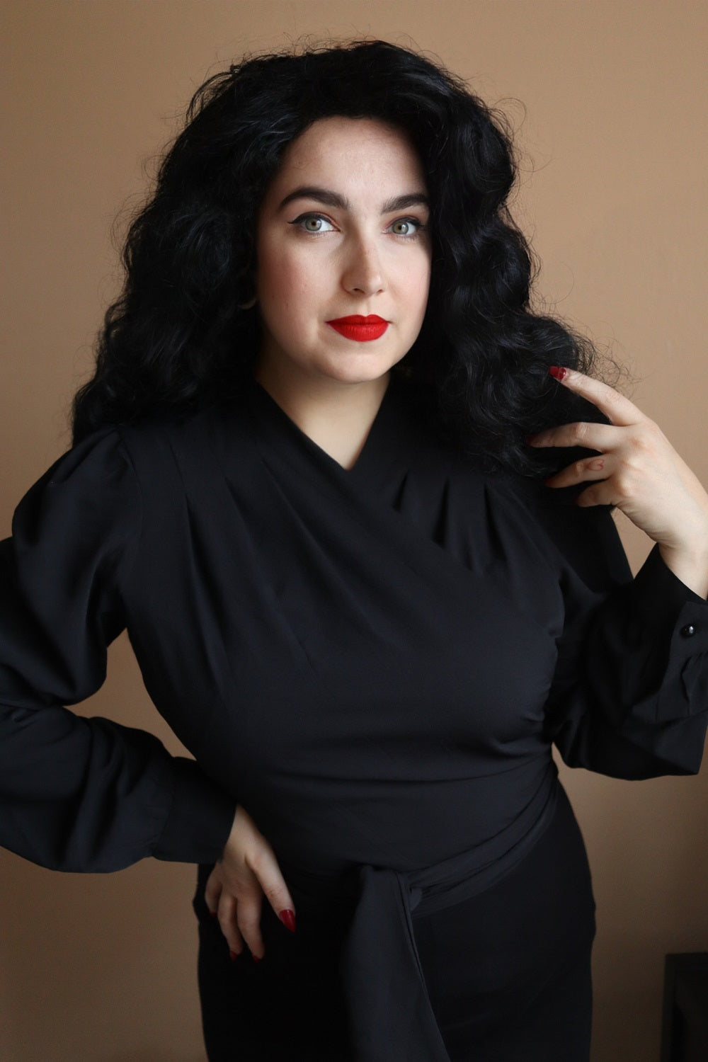 Le chemisier portefeuille à manches longues « Darla » en noir, véritable style vintage