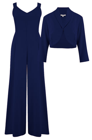 L'ensemble 2 pièces Palazzo Jump Suit et Boléro « Lana » en bleu marine, facile à porter, style vintage