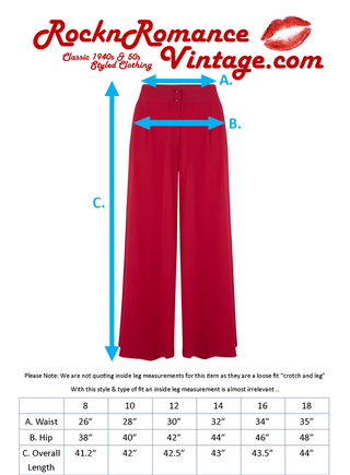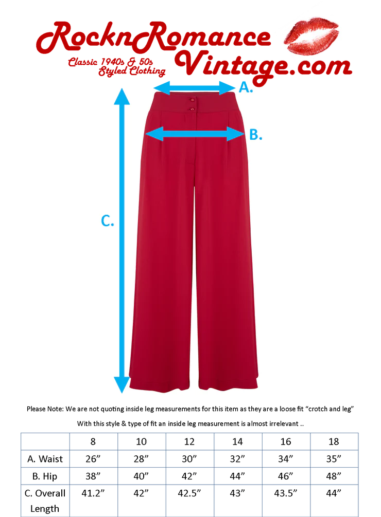 Un classique dans toute garde-robe, criant l'ère d'or d'Hollywood de la fin des années 1940 aux années 1950. La taille haute, double bouton sur le devant et la coupe ample, les jambes larges de style plazo respirent tout simplement le charme. glamour et sophistication.. Facilement porté avec un style vintage à l'esprit, Parfaitement combiné avec un chemisier élégant pour un look de soirée chic/décontracté, Ils conviennent également à un look de bureau de travail classique.. Ce sont votre nouveau rendez-vous "à tout faire" article .. Fini avec une paire de boutons et une ceinture haute, oh et des poches .. oui, ces beautés ont aussi des poches .. Le tissu Polly Crepe de poids moyen s'accroche parfaitement et est super doux au toucher.. facile d'entretien également.