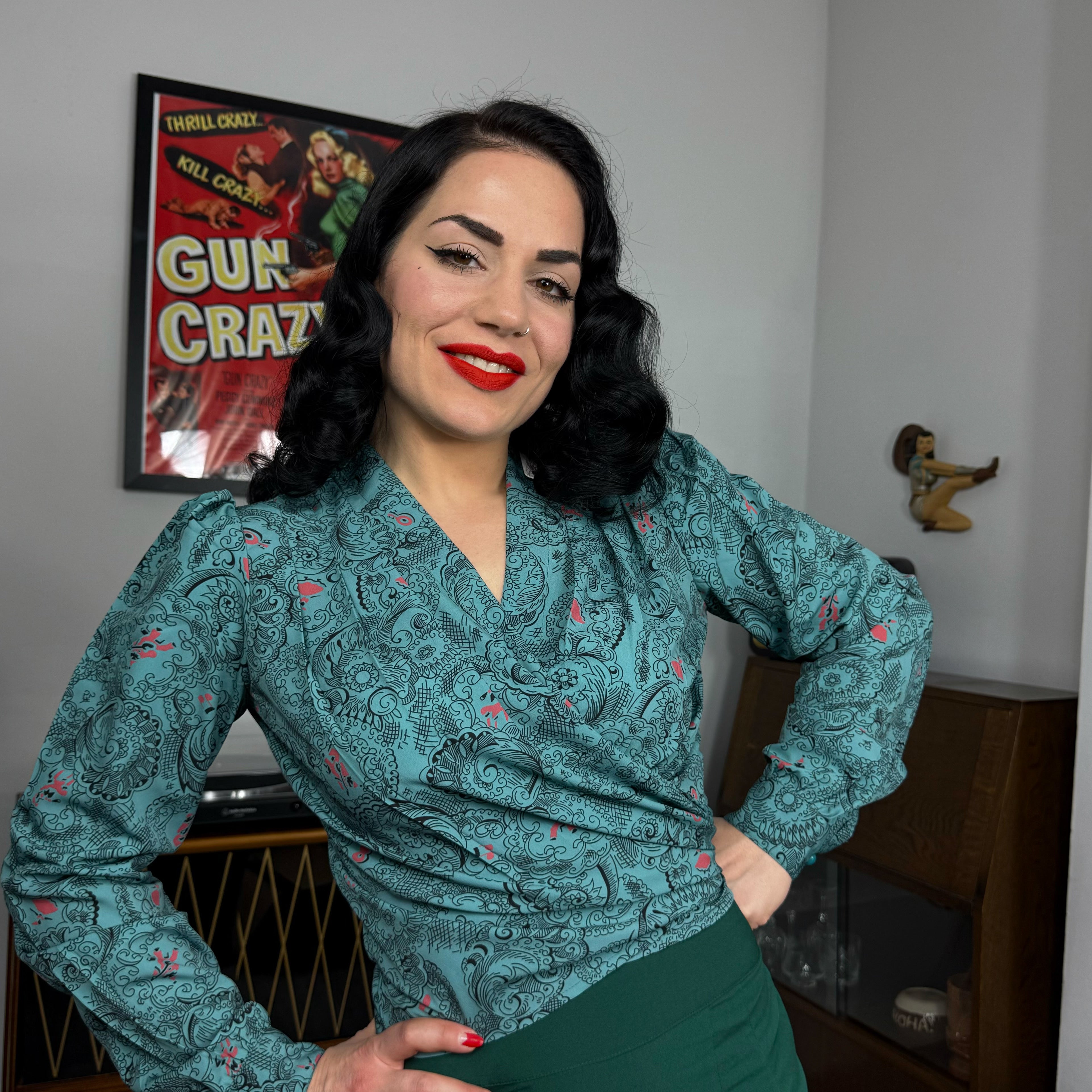 Le véritable chemisier de style vintage le plus polyvalent que vous aurez jamais eu. Le Darla est un chemisier entièrement enveloppant, ce qui signifie que sa coupe est totalement flexible et les plis sur la poitrine sur le devant signifient encore plus de flexibilité, en particulier pour les poitrines plus larges. Attachez-le à l'arrière ou sur le devant, le choix vous appartient entièrement pour créer votre look parfait. Ce chemisier incroyablement et facile à porter se prête à une vaste gamme de styles classiques du début des années 40 jusqu'à la fin des années 50. Vous pouvez facilement l'associer avec des jupes, des pantalons ou même une paire de vos jeans préférés. C'est vraiment la blouse la plus polyvalente que nous connaissons et nous l'adorons .. xx