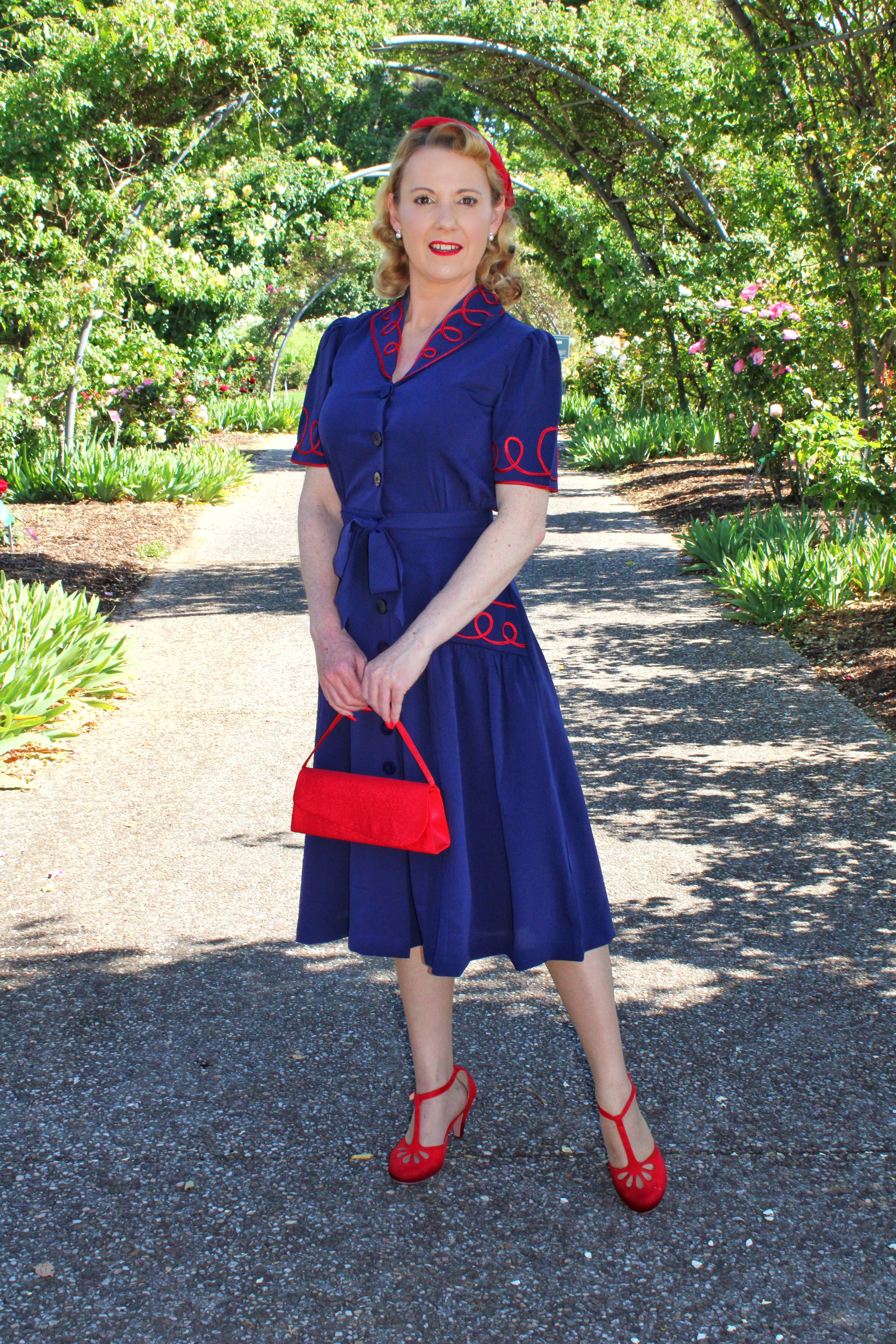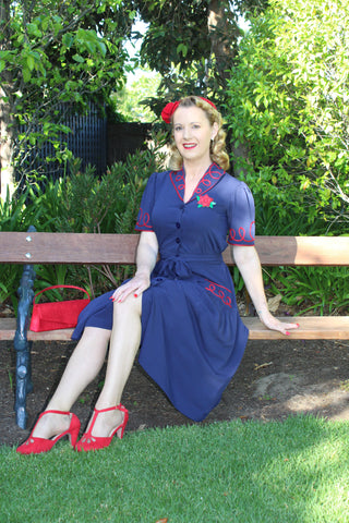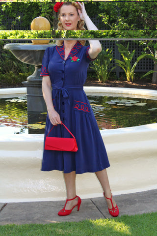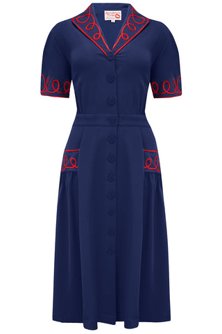 La robe chemise « Loopy-Lou » en marine avec contraste rouge RicRac, véritable style vintage des années 1950
