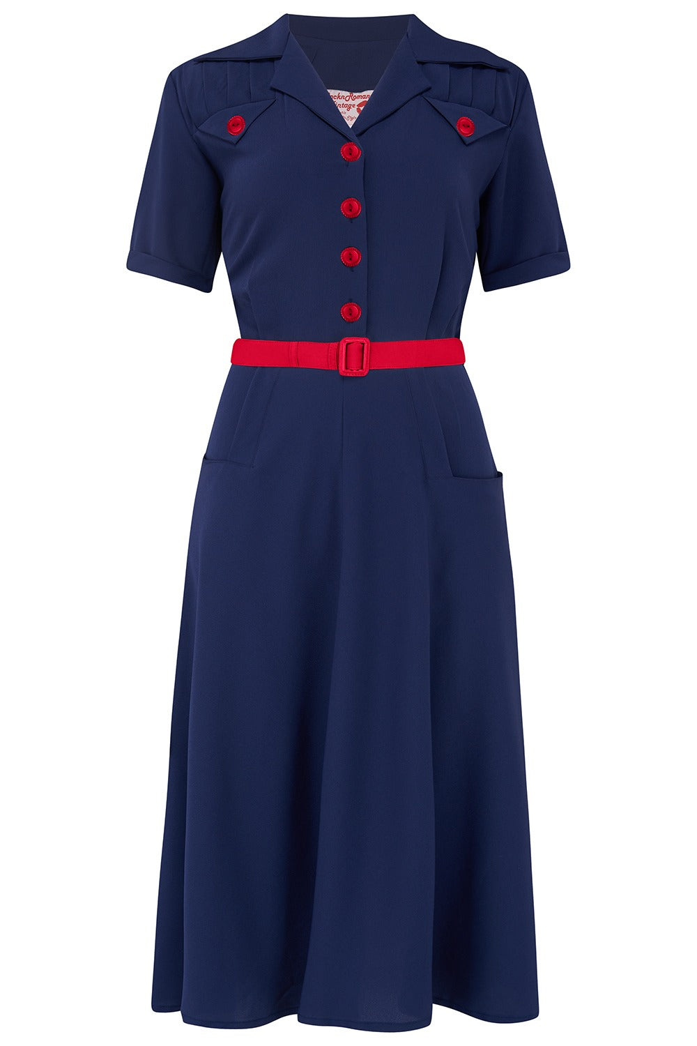 Directement issue de nos archives de style vintage, une copie exacte d'une robe de jour originale de la fin des années 1950 avec de superbes détails de style comme les plis et les boutons sur les épaules avant ainsi que de superbes poches sur les hanches.
