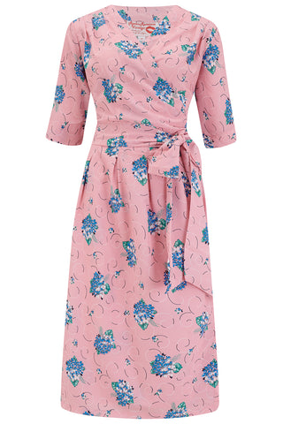 **Vente d'échantillons** La robe portefeuille complète « Vivien » en bouquet d'été rose, véritable style des années 1940 au début des années 1950