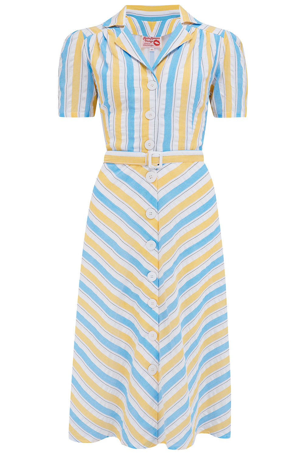 **Limited Edition** Charlene Shirtwaister Dress in Yellow & Blue Stripe, 100% Cotton Seersucker, True 1950s Vintage Style