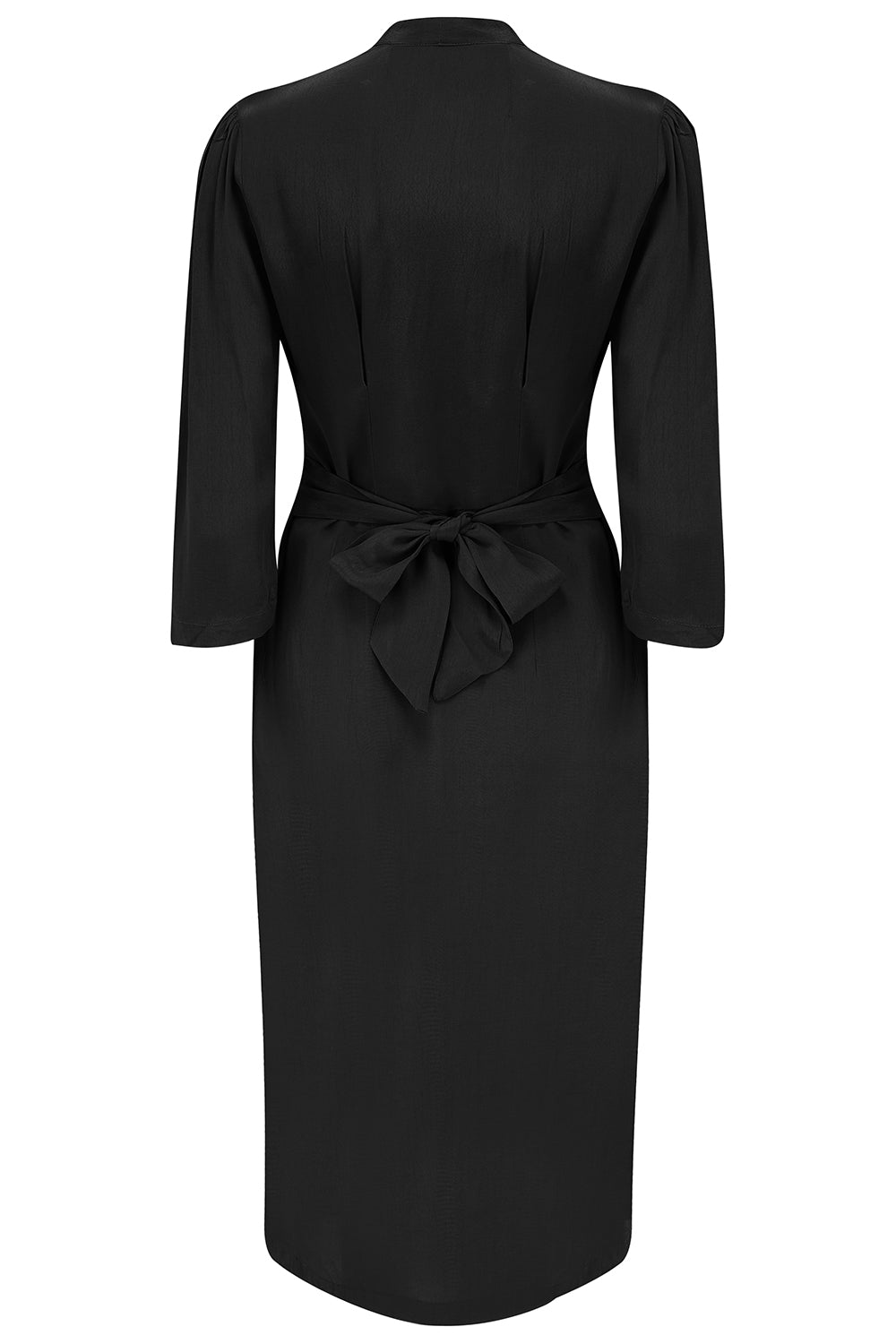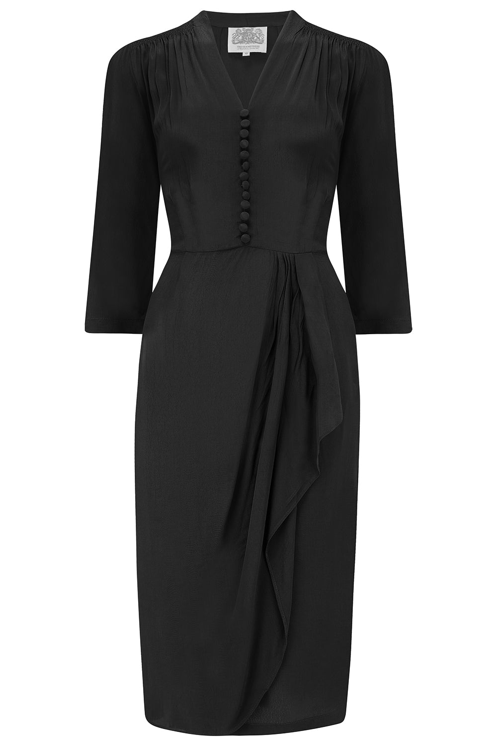 "Mabel" 3/4 Length Sleeve Waterfall Dress in Liquorice Black, A Classic 1940s Inspired Vintage Style