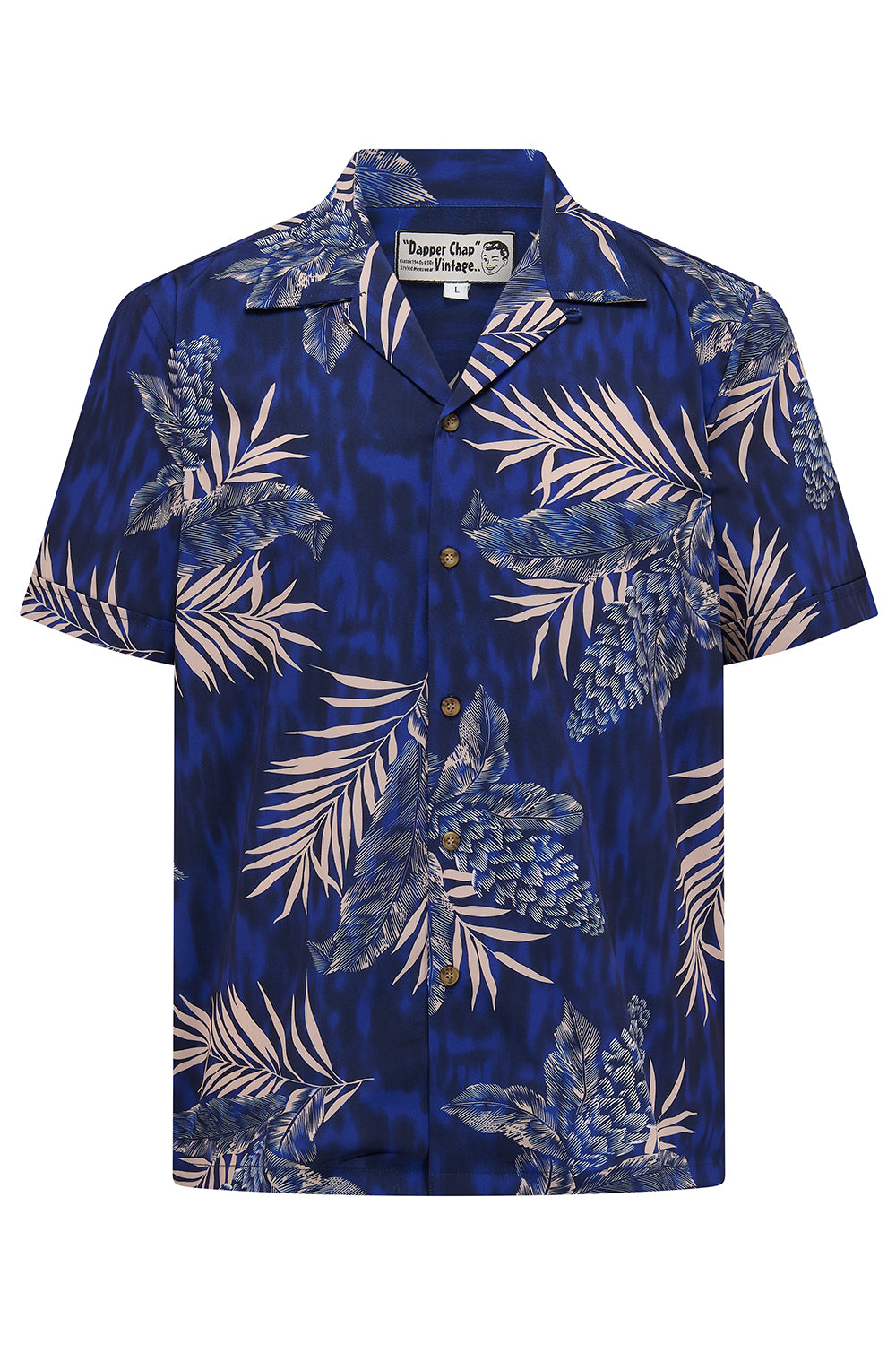 Mens "Cooper" Short Sleeved Casual Hawaiian Shirt In Sapphire Palm. 1950s Sport Shirt