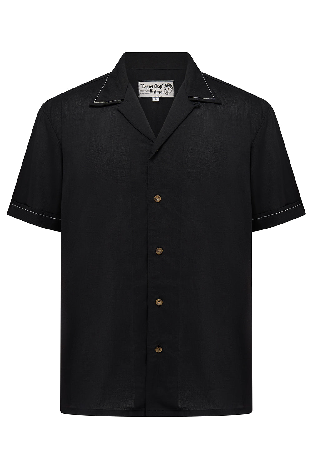 Mens "Cooper" Short Sleeved Shirt In Black With Contrast Saddle Stitch. 1950s Sport Shirt