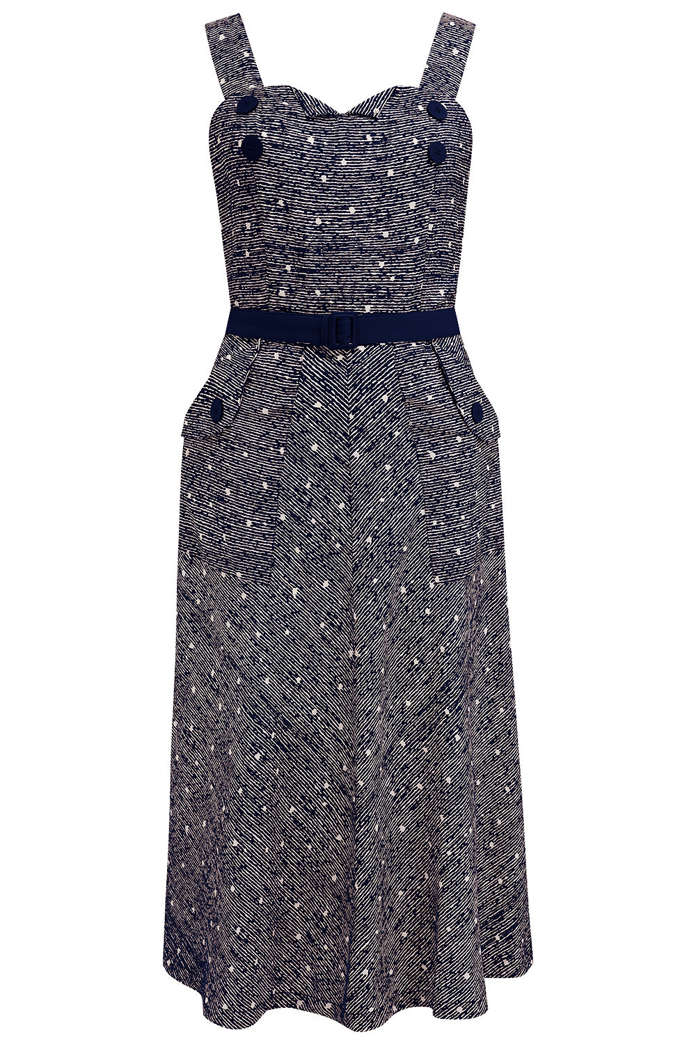 A Stunningly versatile Dress & Buttoned on Detachable Bolero set is the answer to your vintage style needs. This wonderful, easy to wear dress radiates authentic late 1940s - early 1950’s Style with the cute cut and effortless charm, The shrug style bolero is incredibly unique by the way it buttons directly onto the dress at the shoulder straps & can quickly be removed at any time for super versatile outfit.