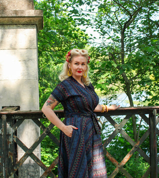 The "Darla" Short Sleeve Wrap Blouse in Panama Stitch Print, True 50s Vintage Style