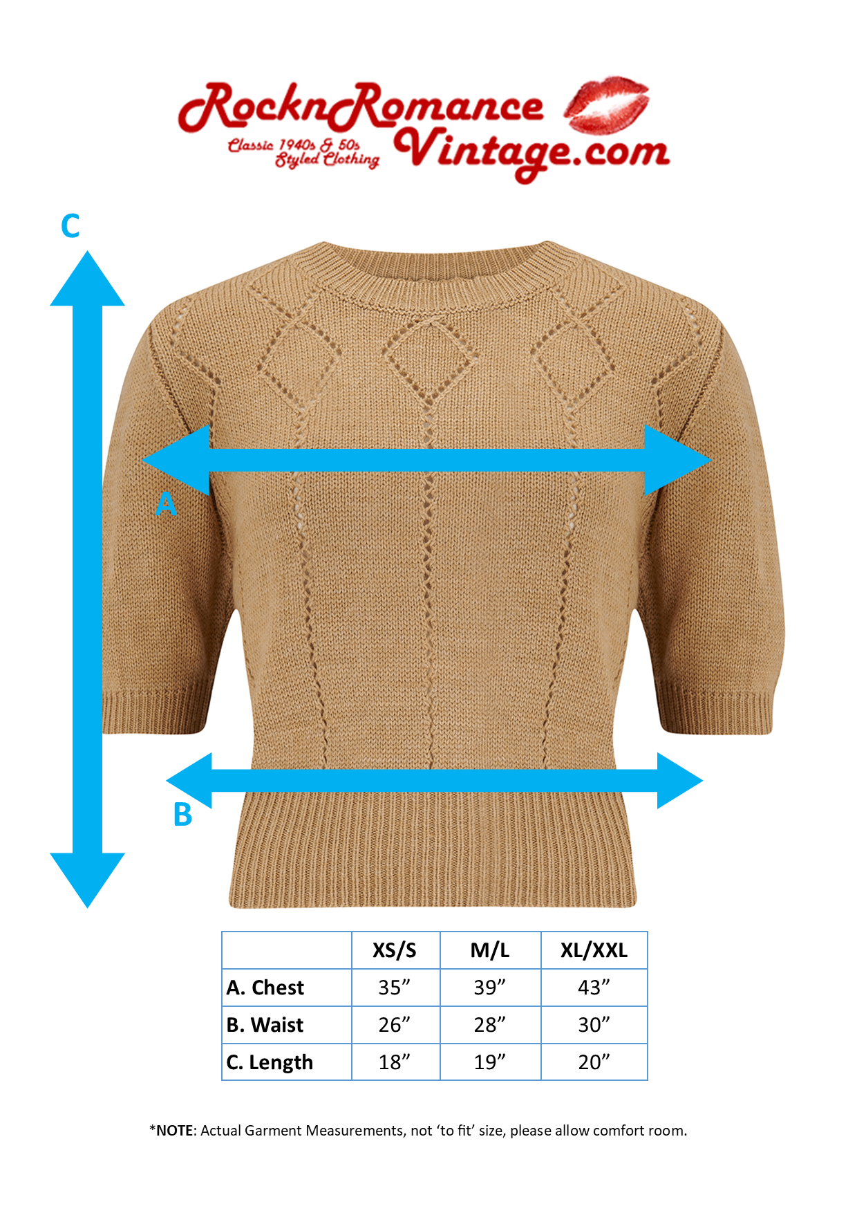 A truly great little 1950s styled jumper/sweater that can very easily be warn with any casual 1940s or 50s look.. Equally at home with a pair of comfy jeans and a pair of flats for a really relaxed style.. This totally versatile little number will be your "go to" item all year.. With cute attention to detail like the classic vintage knit style and cute little neck buttons for easily popping it on over your head without messing up your hair doo.. Made with quality yarns just like the originals, this great little item is just perfect for daytime wear or evening, work or play .. it lends itself to styles such as 1940s, 1950s Rock n Roll, Pin Up, Rockabilly ... It is simply a must have item xx