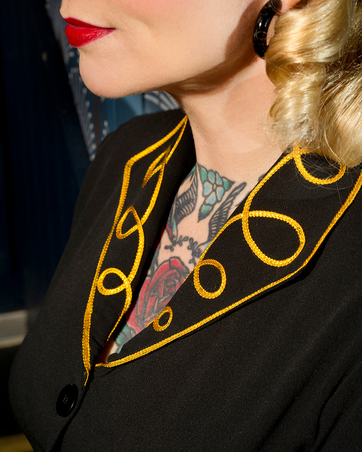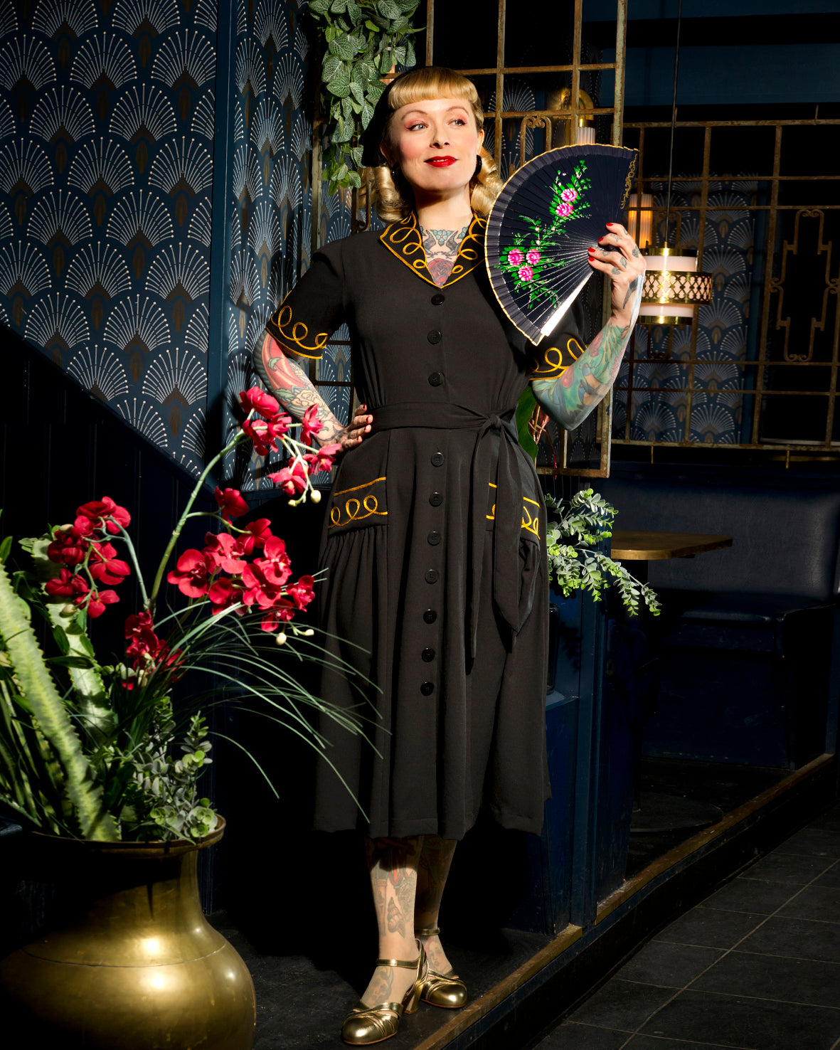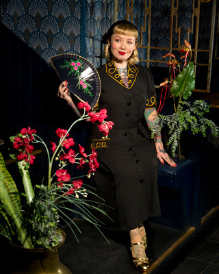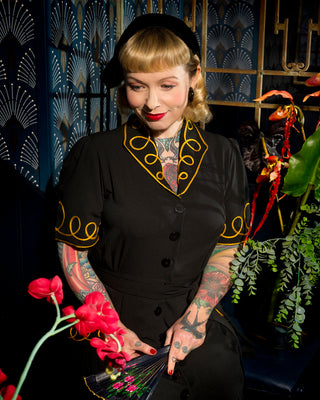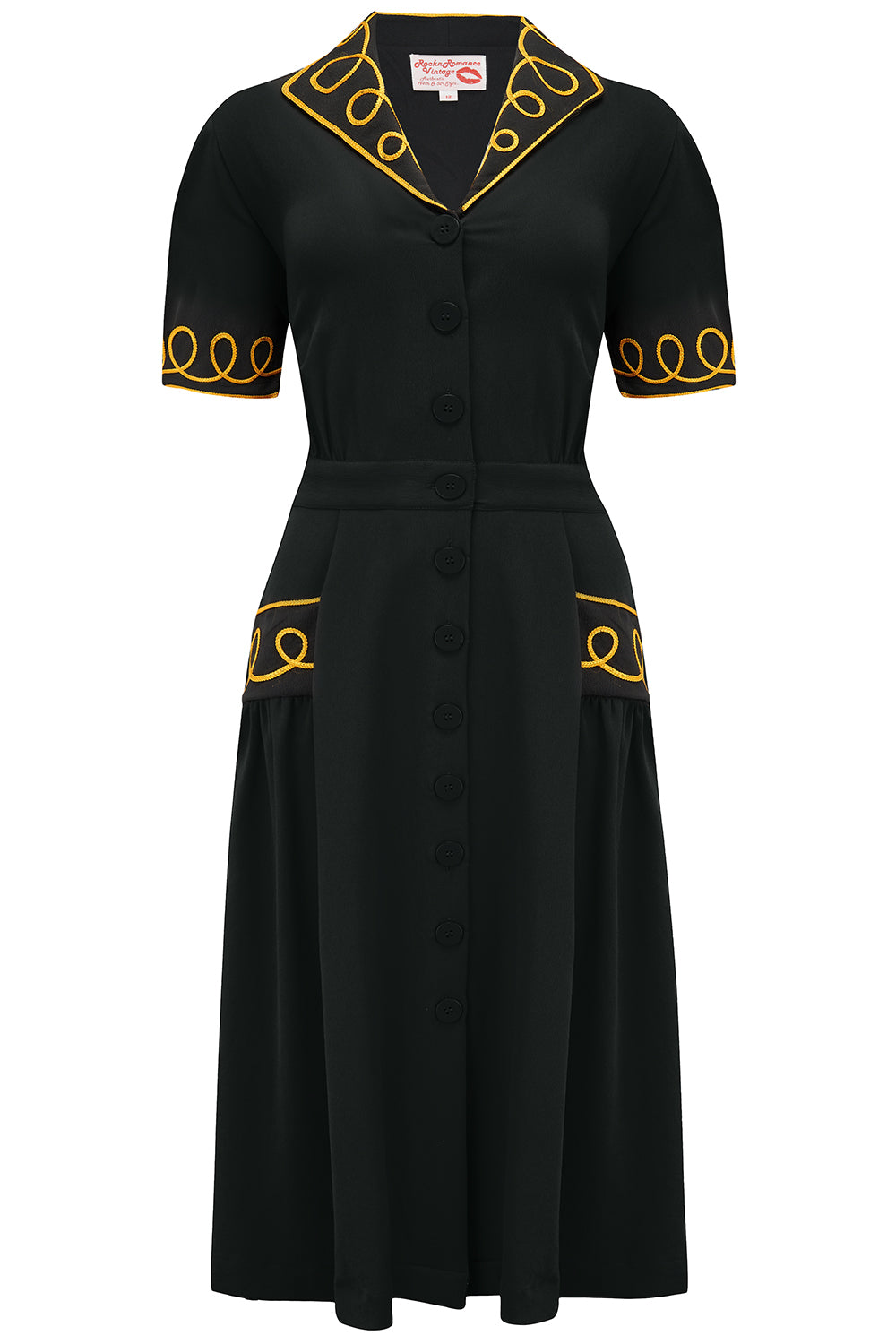 The "Loopy-Lou" Shirtwaister Dress in Black with Contrast Gold RicRac, True 1950s Vintage Style